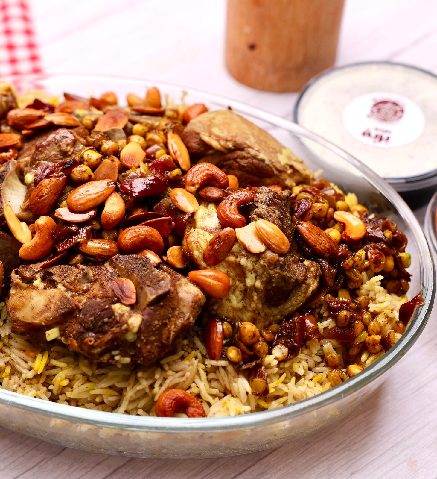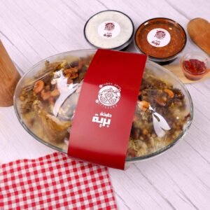بايركس لثلاث اشخاص كبسة لحم برية مع الحشو و ودقوس الطماط الكويتي او السعودي مع معبوج نوعين