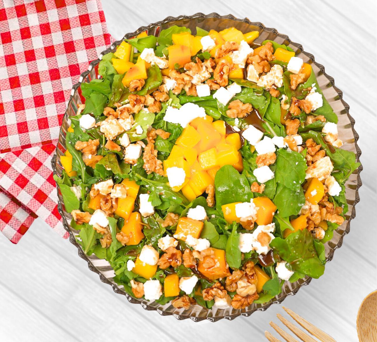 سلطة منعشة وصحية لفصل الصيف مع جبن الفيتا وقطع المانجو والجوز مع شرائح الخبز المقلي